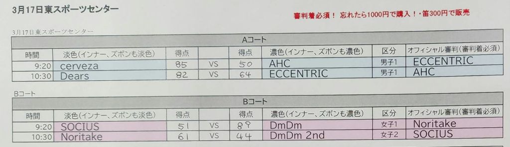 3月17日 天白スポーツセンター 試合結果
