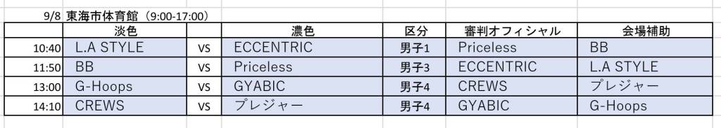 9月8日 東海市体育館 試合予定